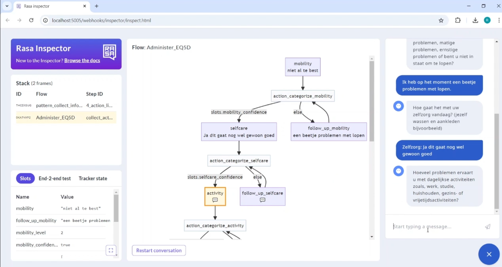 Additionally, we have developed various alternative prototypes to assess the different technological LLM approaches. For example, Roderick Leito investigated RASA's CALM approach for administering the EQ-5D: video.